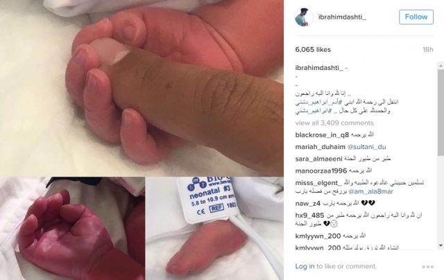 ونشر ابراهيم، عبر حسابه الرسمي على تطبيق "انستغرام"، صورة ليد الرضيع وكتب: "انتقل الى رحمة الله ابني آدم ابراهيم دشتي.. والحمدلله على كل حال".