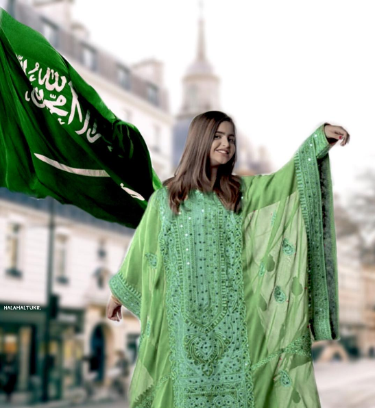 وأطلت الترك بالزي الخليجي التقليدي باللون الأخضر تيمناً بعلم السعودية، معلقةً بقولها: "حدثوني عن الفخر والانتماء والشموخ، أحدثكم عن وطني الذي اتخذ القرآن الكريم دستورا له".