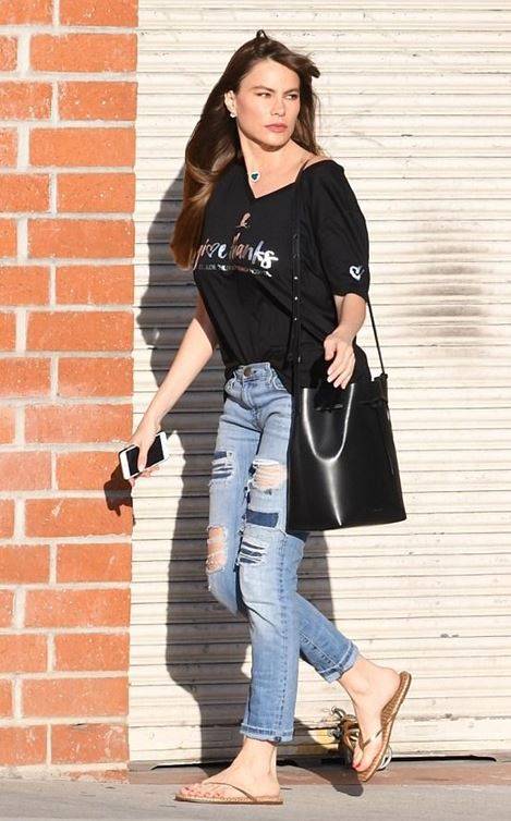 وارتدت صوفيا، البالغة من العمر 45 عاماً، بنطال جينز ممزق باللون الأزرق الفاتح، و"تيشيرت" بسيطاً بأكمام قصيرة باللون الأسود، وانتعلت "صابو" بسيطاً مكشوفاً باللون البيج، وتركت شعرها الطويل منسدلا بطبيعته على ظهرها، وكانت من دون مكياج.