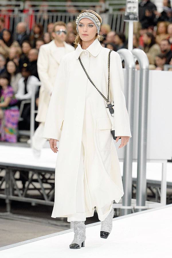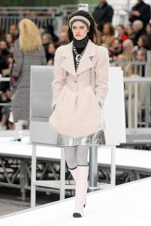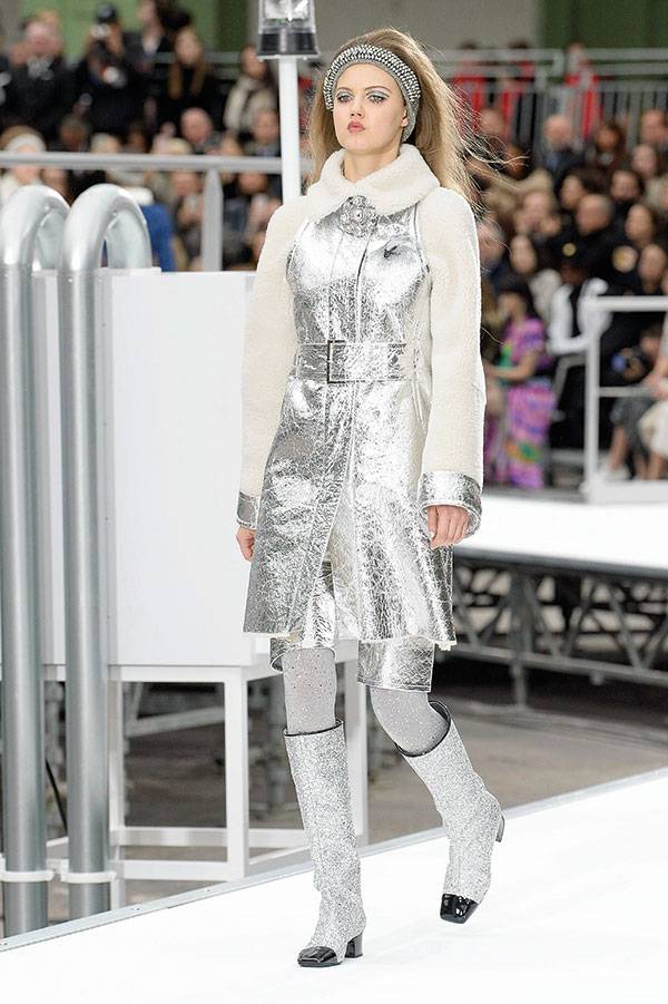 إذا لم تفلح المركبة الفضائية الكبيرة البيضاء اللون، المتمركزة وسط الغران باليه، في أن توحي لنا بأن عرض شانيل سيكون من خارج هذا العالم، فإن الطلّة الأولى في العرض أكدت لنا ذلك الأمر بشكل قاطع. بقيت الطلّة الأولى وفية لبذلة التويد الأصلية ذات القطعتين التي صممتها كوكو، بحيث كشفت هذه المرة عن سترة طويلة، وكمّين قصيرين، مع خيوط فضية منسلّة بين قماش التويد لتسطع لمعاناً عند تنسيقها مع جزمة متلألئة. أبرز تصاميم المجموعة كانت البذلات ذات القطعة الواحدة المصنوعة من التويد الرمادي، ومعاطف الموهير المزينة بالأزرار اللؤلؤية، والمعاطف الفضية المضرّبة ذات الياقات العالية. ووفق رؤية لاغرفيلد للمستقبل، برزت الحاجة فقط إلى مجموعة ألوان بسيطة مقتصرة على الأسود والأبيض والفضي، تم استعمالها لابتكار كنزات وتنانير متلألئة مثل النجوم، وبذلات مطبّعة بالمربعات ونقوش الكواكب والمركبات الفضائية. أما فساتين السهرة فذكّرتنا بحقبة الستينيات إذ كشفت عن ياقات عالية، وحواشٍ مزينة بالريش وتسريحات شعر عالية مثبتة بأربطة جلدية عريضة.