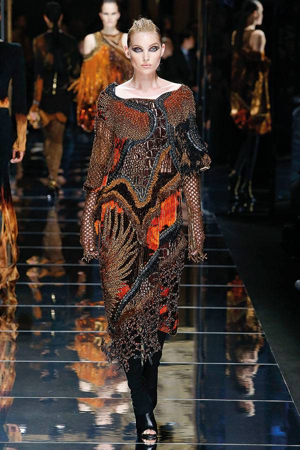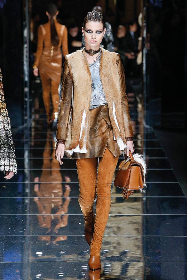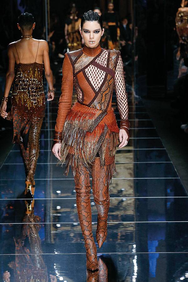 هذا الموسم، تجلت الجاذبية عند بالمين في أشكال وحشية. فالعارضات كشفن عن كحل مائي مثل عيون الهررة واختلن على المنصة بنقوش الفهد، وجلد الأفعى وخطوط النمر. وجسّد كل تصميم حيواناً جديداً... فجلد الأفعى الذي ظهر في بداية المجموعة كان على شكل جزمات بنية عالية، وجوارب مشبكة على شكل حراشف السمك، وفساتين مرقعة. أما الأسد ملك الغابة فظهر على صدر فستان ذهبي معلناً وصول تصاميم سنورية مشتملة على نقوش نمر مطبّعة، وشراريب خردلية مثل لبدة الأسد، ولعل التصميم الأبرز كان فستاناً طويلاً من جلد التمساح، بياقة عالية، باللون البني الداكن، مع أربطة طويلة من الشيفون.