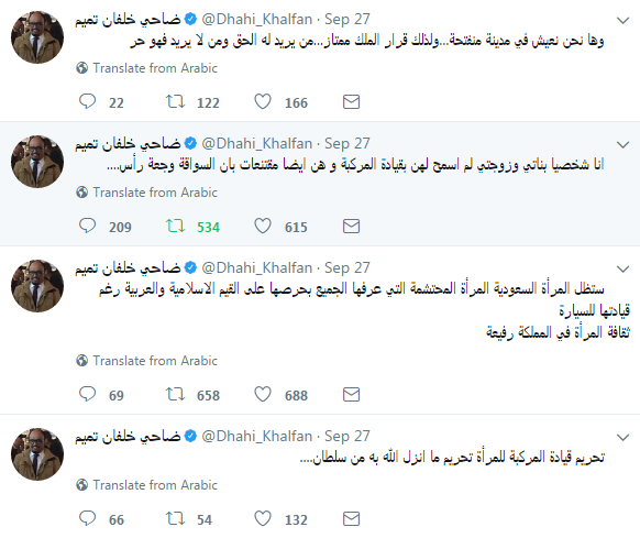 وعلّق، مغرّداً: "تحريم قيادة المركبة للمرأة تحريم ما انزل الله به من سلطان... ستظل المرأة السعودية المرأة المحتشمة التي عرفها الجميع بحرصها على القيم الاسلامية والعربية رغم قيادتها للسيارة، ثقافة المرأة في المملكة رفيعة".