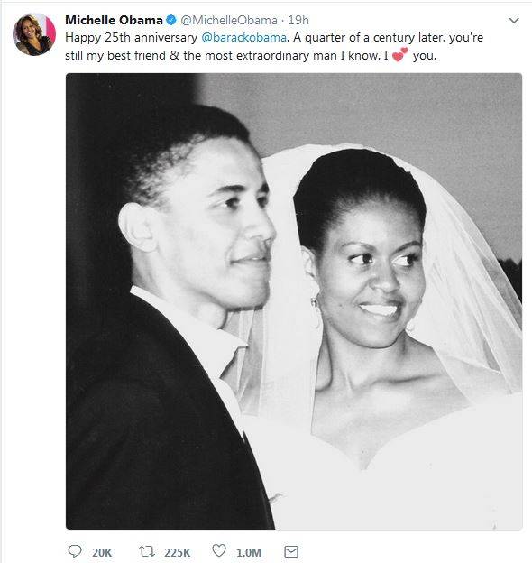 ونشرت ميشيل صورة من يوم زفافهما بالأبيض والأسود عبر حسابها الرسمي على "تويتر"، وكتبت عليها: "ربع قرن مضى، مازلت صديقي المقرب، وأكثر الرجال الذين عرفتهم تميزاً. أحبك".