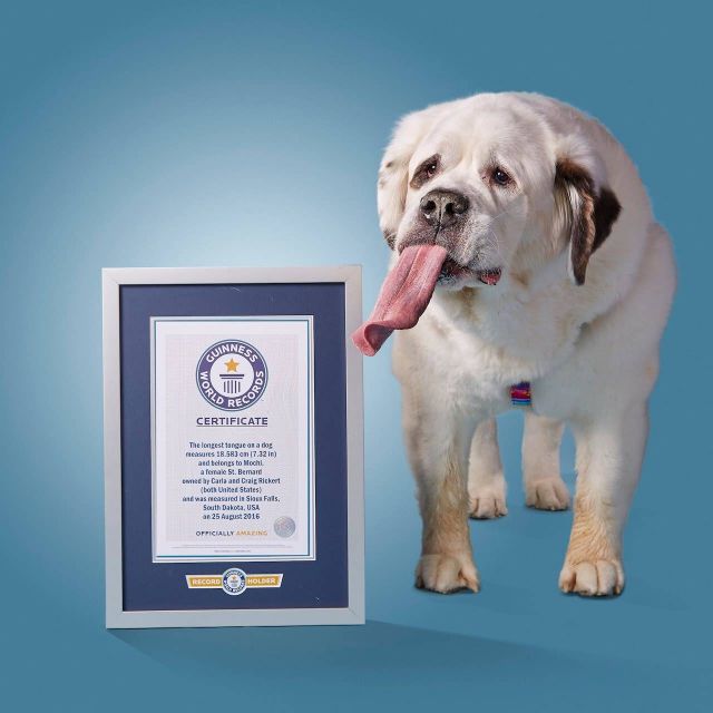 دخل الكلب موشي (مو) البالغ من العمر 8 سنوات ويعيش في ولاية ديكوتا، موسوعة غينيس للأرقام العالمية بعد أن بلغ طول لسانه 18.58 سم.