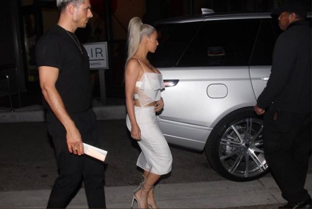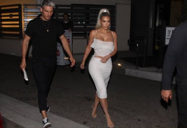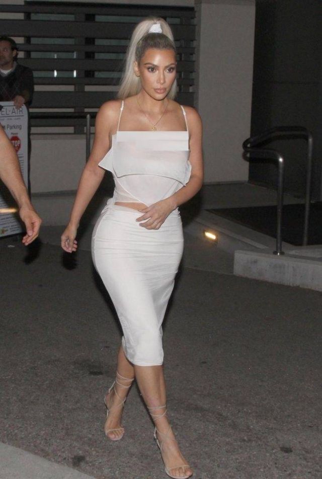 وارتدت كيم البالغة من العمر 36 عاما، في إحدى الاطلالات، فستاناً قصيراً وضيقاً مكشوفاً عند الصدر وبدون أكمام، وانتعلت حذاءً ذا كعب عالٍ، ووضعت مكياجاً بسيطاً.
