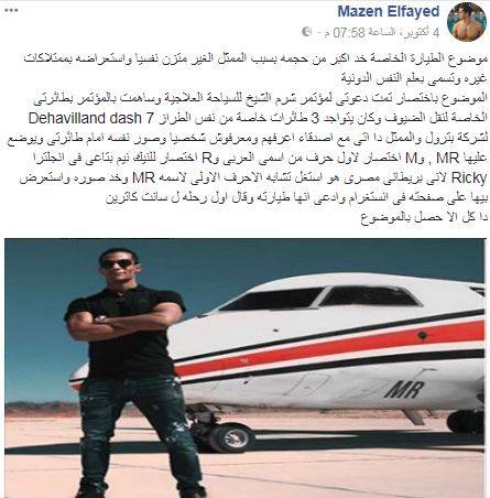 وأضاف "الفايد": "الموضوع باختصار: تمت دعوتى لمؤتمر شرم الشيخ للسياحة العلاجية، وساهمت بالمؤتمر بطائرتى الخاصة لنقل الضيوف، وكانت هناك 3 طائرات خاصة من نفس الطراز Dehavilland dash 7 لشركة بترول، والممثل ده أتى مع اصدقاء اعرفهم وما اعرفوش شخصيا، وصور نفسه أمام طائرتي وعليها MR , وM اختصار لاول حرف من اسمى العربي وR اختصار "للنك نيم" بتاعي في انجلترا Ricky لاني بريطاني مصري. هو استغل تشابه الاحرف الاولى لاسمه MR وخد صورة واستعرض بيها على صفحته في انستغرام وقال أول رحلة ل سانت كاترين".