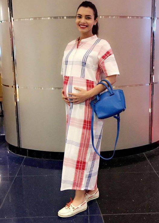 وبدت الشابة بغاية الجمال، بمكياج ناعم، وكانت ترتدي فستان حمل طويلاً، حيث بدت علامات الحمل واضحة عليها.