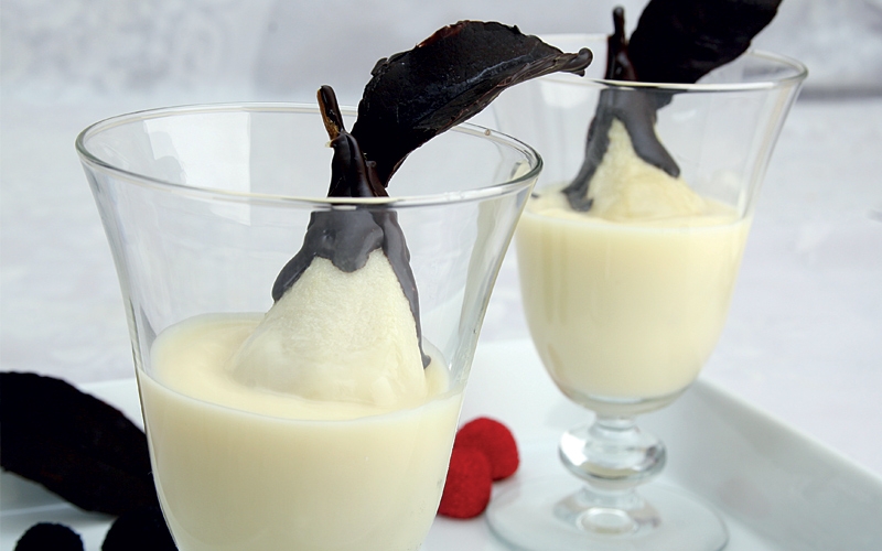تزين الإجاصات بأوراق الشوكولا وتقدم باردة بمثابة نوع لذيذ من الحلوى المنعشة.