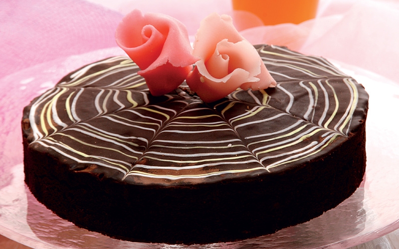 تضاف إليها الشوكولا المفرومة وتحرك معها برفق للحصول على صلصة ناعمة. تسكب هذه الصلصة فوق الجاتوه وتترك لتجمد 10 دقائق ثم يسكب ربع كوب من الكريما الطازجة فوقها بمساعدة ملعقة صغيرة أو كوز ورقي صغير للحصول على خطوط دائرية بيضاء فوق الجاتوه.