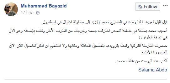 وأعلن عبدو الخبر عبر صفحته على "فايسبوك" وكتب قائلاً: "قبل قليل تعرضت أنا وصديقي المخرج محمد بايزيد إلى محاولة اغتيال في اسطنبول. أصيب محمد بطعنة في منطقة الصدر اخترقت جسمه وخرجت من الطرف الآخر وقمت بإسعافه وهو الآن في غرفة الطوارئ".