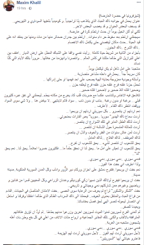 وختم: "لم أتمنى الفرح لسوريين تمنوا الموت لسوريين اخرين وزرعوا مدنهم بطاطا ..لم أودّ ان تؤرق هتافاتهم المترافقة بالالقاب والكنى..تلك المقابر الجماعية و ارواح مئات الالاف من اهلي في كل بقع وطن بات أهله يشجعون منتخبه من الغربة.. فدمي سوري ..دمي سوري ...دمي سوري.. لأجل سوريتي أردت لهم الفوز .. لأجل سوريتي أردت لهم الهزيمة .. فاعذروا خيانتي أيها "السوريتين". ..