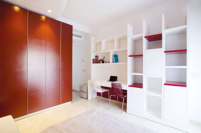 غرف النوم الأربع المخصّصة للأولاد متشابهة في التصاميم. طغى عليها اللون الأبيض للخشب في السرير والمكتبة الكبيرة التي شغلت الحائط، ولكن منها ما تطعمّ الأبيض فيها بالأحمر، أو الأزرق للخزائن والكراسي والأكسسوارات.