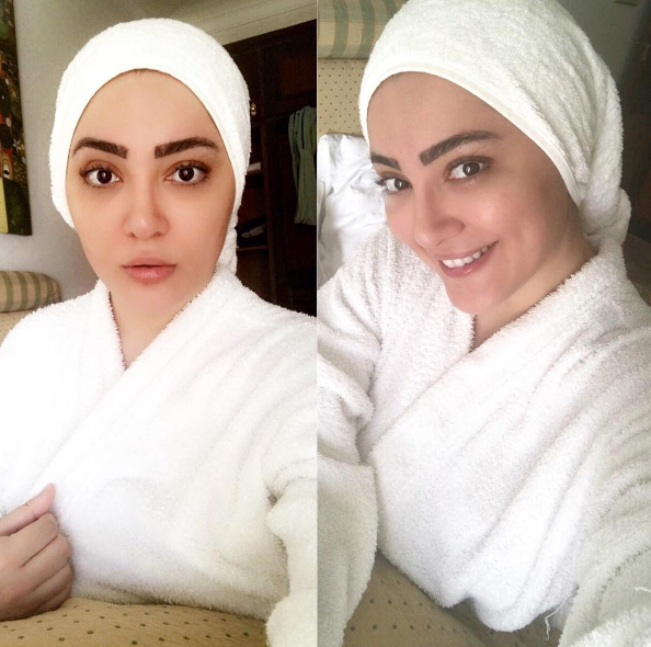 ونشرت الممثلة، المولودة في السعودية، صورة لها عبر حسابها في تطبيق "انستغرام" اثر خروجها من الحمام بلا مكياج، وقالت: "حمام الهنا بعد أحلى حمام مغربي".