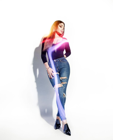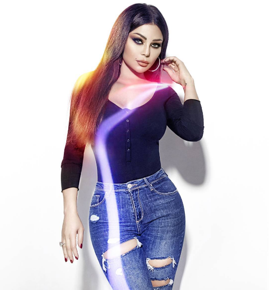 وظهرت وهبي في الصورة بمفهوم "الإشعاع" بإطلالة "كاجوال"، مرتديةً "توب" ضيقة وبنطال ممزق من قماش الدنيم (جينز).