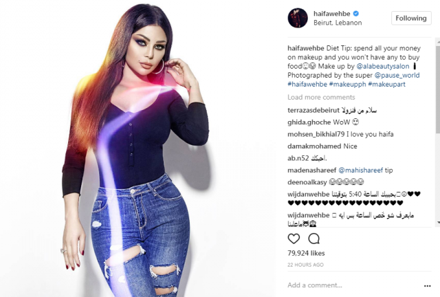 ونشرت الفنانة اللبنانية صورة لها عبر حسابها على تطبيق "انستغرام" معلقةً بالقول: "نصيحة حمية غذائية: انفقي جميع اموالك على المكياج، فلا يظل لك أي مال لانفاقه على الطعام".
