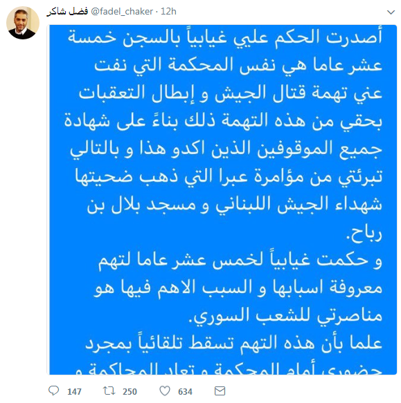 وغرّد شاكر عبر حسابه في موقع "تويتر": "المحكمة التي أصدرت الحكم علي غيابيا بالسجن خمسة عشر عاما، هي نفس المحكمة الي نفت عني هذه التهمة، وذلك بناء على شهادة جميع الموقوفين الذين أكدوا هذا، وبالتالي تبرئتي من مؤامرة عبرا التي ذهب ضحيتها شهداء الجيش اللبناني ومسجد بلال بن رباح".
