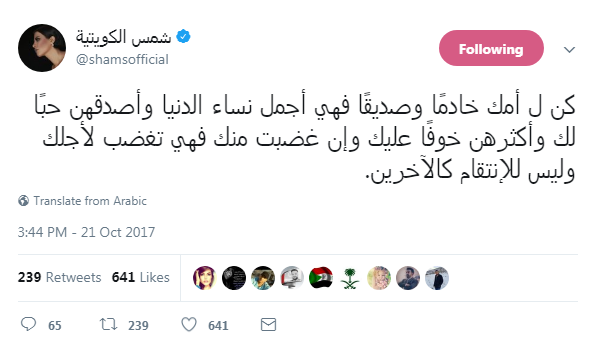 وغرّدت شمس عبر حسابها الرسمي على موقع "تويتر" قائلةً: "كن لأمك خادمًا وصديقًا، فهي أجمل نساء الدنيا وأصدقهن حبًا لك وأكثرهن خوفًا عليك".