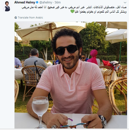وكتب حلمي قائلاً: "مساء الفل.. متصدقوش الإشاعات .. انتشر خبر إني مريض.. ده خبر غير صحيح.. أنا الحمد لله مش مريض.. وبشكر كل الناس اللي كلموني أو بعتولي يطمنوا عليا".