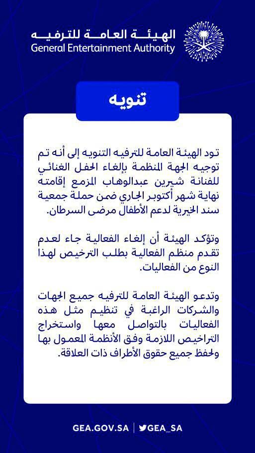 فاجأت الهيئة العامة للترفيه في المملكة العربية السعودية، جمهور النجمة شيرين عبدالوهاب، بالإعلان عن إلغاء حفلها المنوي إقامته نهاية شهر تشرين الأول/أكتوبر الجاري، في الرياض، وذلك ضمن إطار حفل الليالي العربية الخامس الذي تقيمه حملة جمعية سند الخيرية لدعم أطفال مرضى السرطان. وكانت شيرين ستقدّم فقرة غنائية مخصصة للنساء، وقد نشرت الهيئة عبر حسابها على «تويتر»، بياناً قالت فيه: «إنّ الإلغاء جاء لعدم تقدّم الجهة المنظّمة بطلب ترخيص لإقامة الحفل، وبالتالي لن تستطيع عبدالوهاب اعتلاء خشبة المسرح إن لم تملك التصاريح اللازمة مع الجهة المنظمة». وقد ذكّرت الهيئة الجهات الراغبة في تنظيم حفلات فنّية، بأن تتقدّم لطلب الرخص وفق الأنظمة المعمول بها. وفي موازاة ذلك، تداول بعض روّاد تواصل الاجتماعي أخباراً تشير إلى أنّ أسعار بطاقات الحفل في قاعة نيارة، تراوحت بين 3000 و10000 ريال سعودي ، ما أثار ضجةً كبيرة على تويتر، وقد خرج مغرّدون بوسم «#شيرين_في_الرياض»، متسائلين عن سبب ارتفاع أسعار البطاقات.