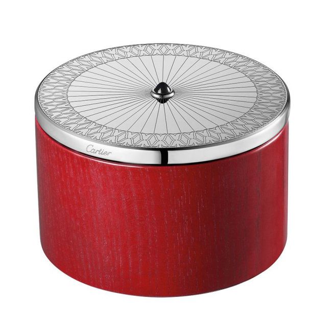 من منّا لا تحتاج إلى صناديق أو علب تضع فيها مقتنياتها النفيسة، ولا سيّما إذا كانت مجوهرات كارتييه؟ لهذا الغرض، تقدّم لك الدار ثلاث علب مجوهرات دائرية من الخشب، الأولى رمادية اللون مطلية بالورنيش الشديد اللمعان، غطاؤها معدني مزيّن بنقش مستوحى من الـ«آرت ديكو» وحجر اليشب الأحمر. والثانية جاءت باللون البرغندي، مطلية بالورنيش الشديد اللمعان، فيما غطاؤها المعدني مزيّن بنقش حرف C المزدوج وحجر العقيق. أما العلبة الثالثة فجاءت خضراء، وهي أيضًا مطلية بالورنيش الشديد اللمعان، فيما غطاؤها المعدني مزيّن بنقش الـ«آرت ديكو» وحجر الليبودوليت الكريم الصدفي.