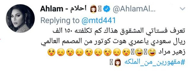 وأجابته: "تعرف فستاني المشقوق هذاك كم تكلفته؟ 150 ألف ريال سعودي يا عمري.. هوت كوتور من المصمم العالمي زهير مراد".