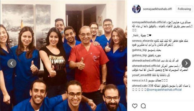 وظهرت العروس في الصورة وهي برفقة دكتور تجميل الأسنان والطاقم الخاص في عيادته، وعلّقت عليها قائلة: "مساكم ورد حبايبي. مع الدكتور باسم سمير وفريق الأطباء بالعيادة.. بالتوفيق دائماً إن شاء الله".