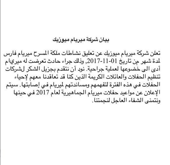 وقد نشرت شركة "ميريام ميوزك"، عبر حسابها الرسمي على "إنستغرام، بياناً جاء فيه: "تعلن شركة ميريام ميوزك تعليق نشاطات ملكة المسرح ميريام فارس لمدة شهر من تاريخ 1- 11-2017، وذلك جراء حادث تعرضت له ميريام أدى إلى خضوعها لعملية جراحية".