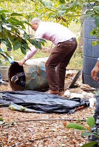 وأضاف البيان أنه بعدما تأكد من وفاته، عمل على إنزال الجثة بصعوبة في برميل للمياه، ووضع فوقه حجراً وبعض أوراق الأشجار للتمويه، ثم أخفى ملابسه التي كان يرتديها أثناء ارتكابه الجريمة، في حفرة قرب منزله.