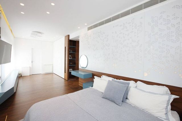 وقمّة الهدوء الجمالية والعملية تجسّدت بين جدران غرفة النوم الماستر، حيث ساهم في كبر مساحتها استخدام اللون الأبيض للجدار والخشب الزاهي للمكتبة والخزائن. وجاءت الواجهة الزجاج لتضفي حياة ونوراً على هذا الركن كما في الصالونات.
