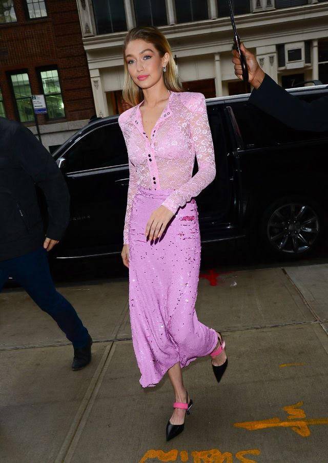 يبدو أن اللون الزهري هو الأقرب الى قلب عارضة الأزياء الشهيرة جيجي حديد، حيث رُصدت من جديد بإطلالة زهرية ناعمة، من رأسها حتى أخمص قدميها. واختارت تنورة من الترتر من علامة Nina Ricci يبلغ ثمنها 4,290 دولاراً أميركياً، ونسقتها مع توب من الدانتيل المرهف من العلامة نفسها يبلغ ثمنها نحو 1,000 دولار أميركي، واستكملت اطلالتها بحذاء عصري من توقيع Prada يبلغ ثمنه 950 دولاراً أميركياً.