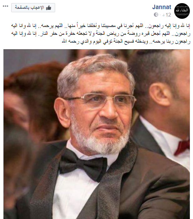 وبعده بدقائق، أعلنت جنات عن الخبر الأليم على صفحتها الرسمية بموقع "فايسبوك"، وقالت في المنشور: "توفي اليوم والدي رحمه الله، إنا لله وإنا إليه راجعون.. اللهم أجرنا في مصيبتنا وأخلفنا خيراً منها.. اللهم يرحمه".