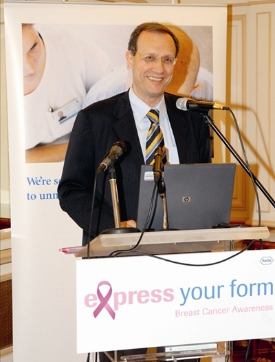يعتبر سرطان الثدي ثاني أنواع السرطان الأكثر شيوعاً في العالم والسرطان الأكثر انتشاراً بين النساء. لم يعد مسموحاً أن تتهرّب المرأة التي تعاني أعراضاً معينة أو تشك بإصابتها بالمرض من استشارة الطبيب خوفاً من اكتشافه. فالكشف المبكر ينقذ حياتها ويساعدها في قهر المرض، أما الإهمال فسلاح تضعه بيد المرض حتى يقهرها. في المؤتمر الذي عقدته شركة روش Roche ضمن برنامجها لنشر الوعي حول سرطان الثدي، تحدث البروفيسور اللبناني الاختصاصي بالأورام السرطانية وأمراض الدم ناجي الصغير مشدداً على أهمية الكشف المبكر الذي يسمح بالشفاء التام بنسبة تفوق ٩٠ في المئة.