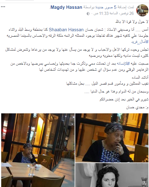 وكتب المهندس المصري مجدي حسان، على صفحته في فايسبوك: "أمس أنا وصديقي الأستاذ شعبان حسان كنا بمنطقة وسط البلد، وأثناء جلوسنا على كافيه شهير هناك تفاجأنا بوجود الممثلة الرائعة ملكة الرقة والإحساس بالسينما المصرية آمال فريد".