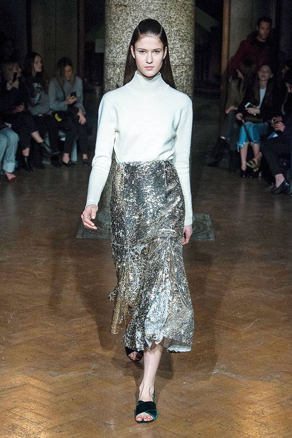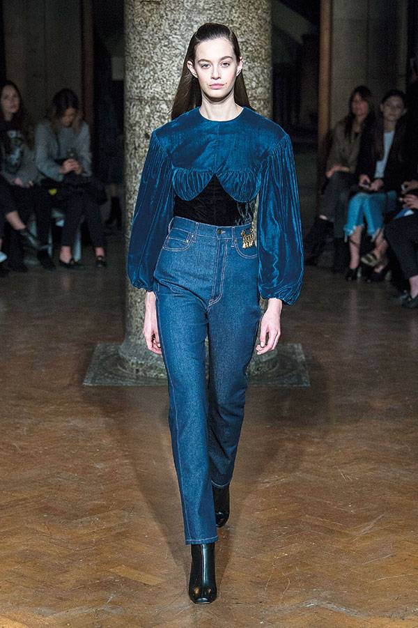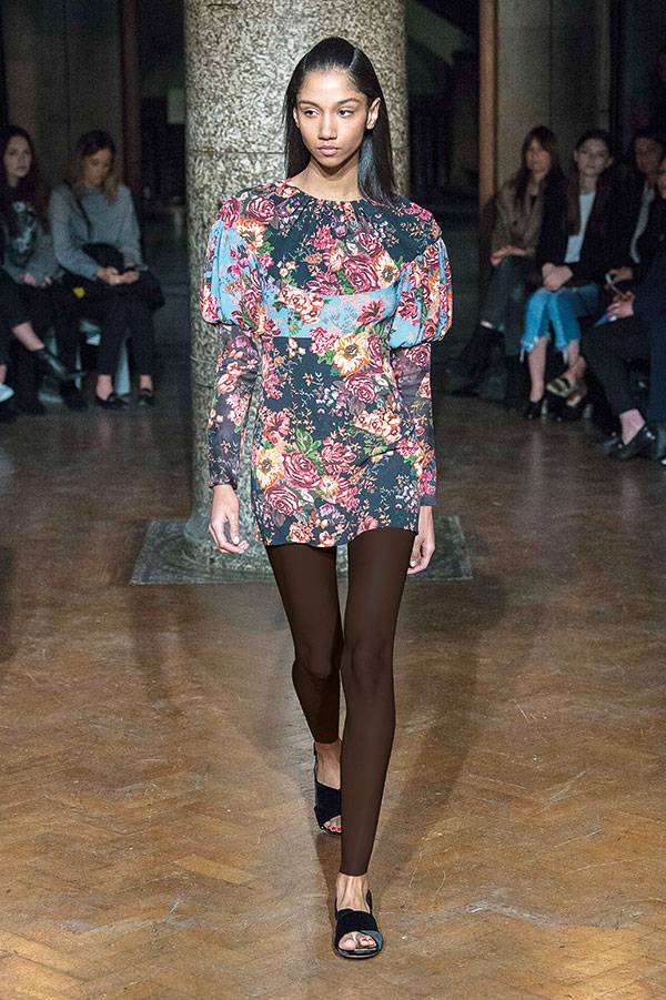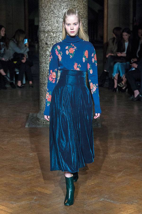 ارتكزت هذه المجموعة على الأسلوب العتيق لناحية الأشكال والقصّات. الأكتاف دائرية، والتنانير طويلة، لكن الألوان الباردة تقاطعت مع الأحمر الساطع والأخضر الحيوي للمسة عصرية. وللمرة الأولى، لاحظنا عند إيميليا ويكستيد الجينز الكحلي العالي الخصر، والفساتين القصيرة جداً المطبّعة بالأزهار.