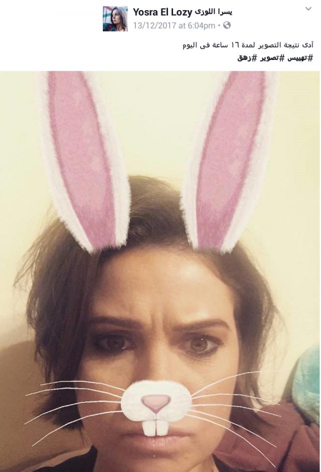 نشرت الفنانة يسرا اللوزي صورة جديدة لها عبر صفحتها الشخصية على "انستغرام"، ظهرت فيها على طريقة تطبيق "سناب شات"، فتحولت من خلالها إلى أرنب.