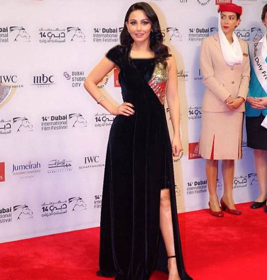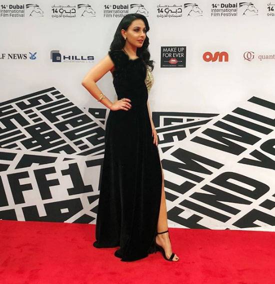 والتقطت الصور خلال وقوفها على السجادة الحمراء لختام فعاليات الدورة الـ 14 من مهرجان دبي السينمائي.