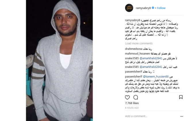 وجه الفنان المصري رامي صبري رسالة الى جمهوره من خلف قضبان السجن، موكداً انه بخير.