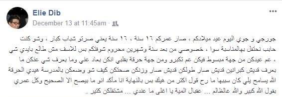 وكتب: "جورجي وجوي اليوم عيد ميلادكم، صار عمركم 16 سنة، 16 سنة يعني صرتوا شباب كبار، وشو كنت حابب نحتفل بهالمناسبة سوا، خصوصي من بعد سنة وشهرين محروم شوفتكم بس للأسف مش طالع بإيدي شي".