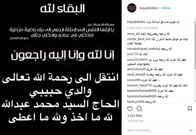 فُجعت الفنانة الكويتية ميّ عبدالله بوفاة والدها الحاج السيد محمد عبدالله صباح اليوم (السبت)، ناعيةً اياه عبر حسابها الشخصي في موقع "انتسغرام".