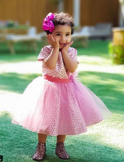 وخطفت الطفلة الانظار بفستان زهري صمم خصيصا لها باستخدام عنوان الحفل وهو البطيخ، حيث تم طبعه على القماش وتم تطريز طائر فلامنغو عليه باليد.