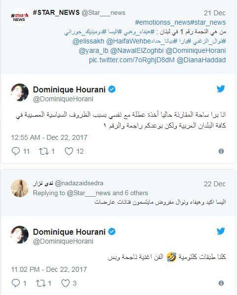 وفي التفاصيل، وبعدما أعلنت إحدى الصفحات على "تويتر" عن استفتاء حول النجمة الأولى في لبنان، ردّت دومينيك بتغريدة، جاء فيها: "انا برا ساحة المقارنة حاليا آخذة عطلة مع نفسي بسبب الظروف السياسية العصيبة في كافة البلدان العربية، ولكن بوعدكم راجعة والرقم ١".