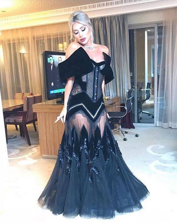 واختارت فستاناً أسود من تصميم اللبناني نيكولا جبران، وتم تصميمه بالعديد من الخامات فبدا مزدحماً، ففيه جزء من المخمل وجزء آخر من التول والدزء الاخير دانتيل وشيفون.