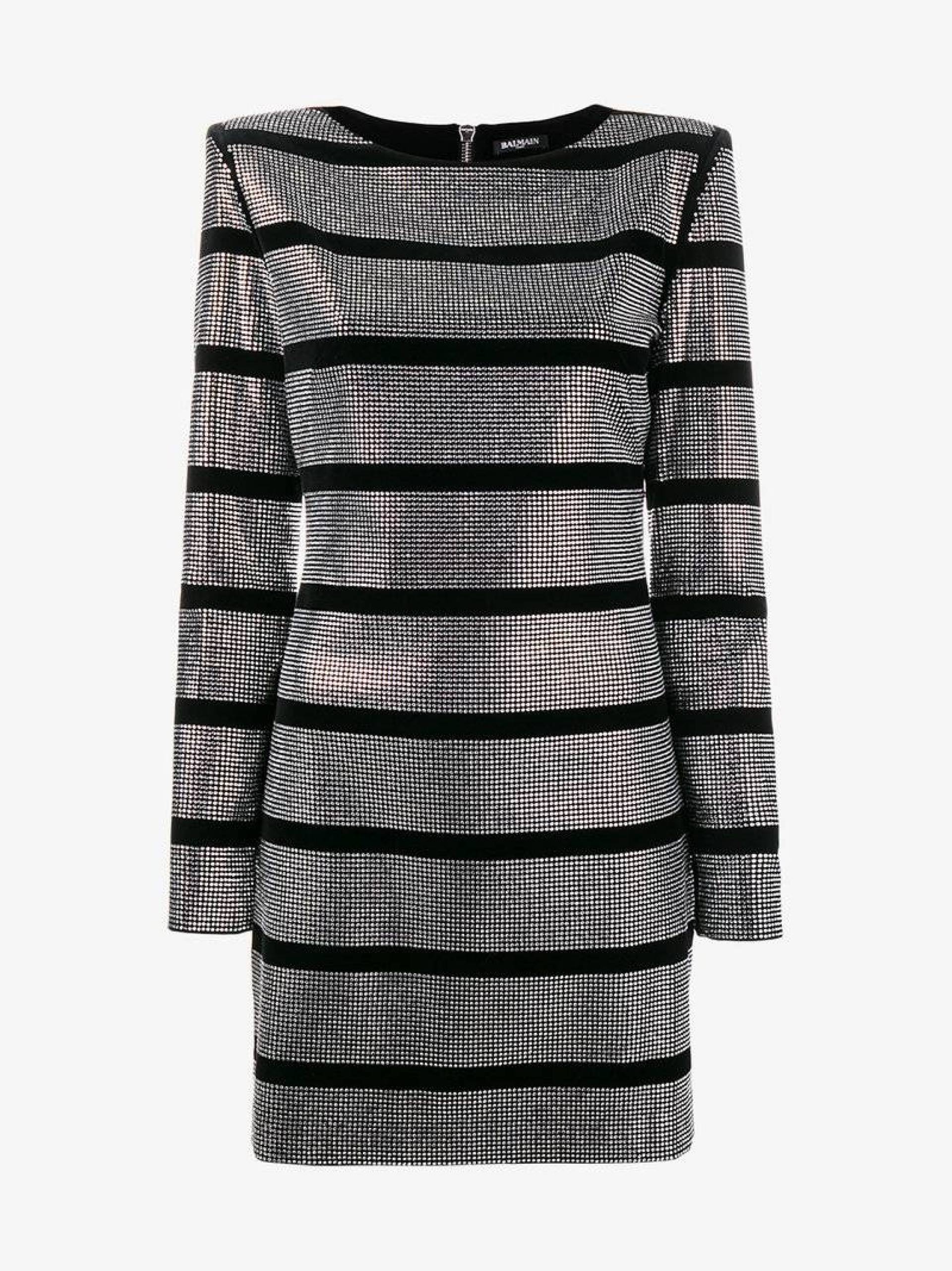 شاعت بين النجمات أخيراً صيحة الفساتين بالقصّة القصيرة والضيّقة. فأتقنت شذى حسون اعتمادها باختيارها فستاناً من بالمان يبلغ سعره $2590 تميز بحبيبات الكريستال البرّاقة وخامة المخمل باللون الأسود وانتعلت معه حذاء جمع بين اللونين الأسود والفضي أيضاً. وقد أرفقت شذى إطلالتها هذه بتسريحة شعر رترو وماكياج مبهر اعتمدت من خلاله على جاذبية أحمر الشفاه باللون الزهري اللمّاع والبارز.