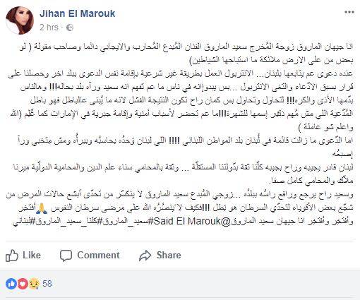 وختمت: "وسعيد راح يرجع ورافع راسُه ببلدُه... زوجي المُبدع سعيد الماروق لا ينكسّر من تحدّى أبشع حالات المرض من شجّع بعض الأقوياء لتحدّي السرطان هو بَطل!!! فكيف لا ينصُرُه الله على مرضى سرطان النفوس. أفتخِر وأفتخِر وأفتخِر انا جيهان سعيد الماروق. كلنا سعيد الماروق لبناني".