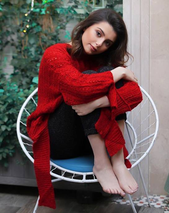 وأطلت بالصورة في الحديقة جالسة على كرسي حافية القدمين، مرتديةً "كاب" طويل أحمر من الصوف.