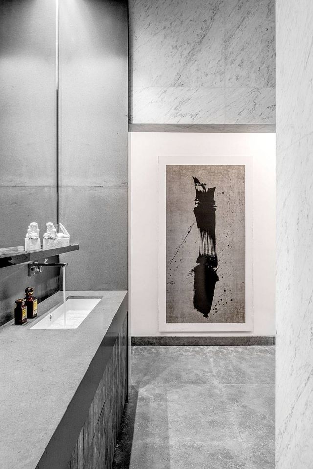 وقبل الدخول في التفاصيل الهندسية لهذه الشقة، لا بدّ من التوقّف أمام الأرض التي أكسبتها رونقاً وأسلوباً خاصاً. فهي توحي بأنّها من الباطون، لكن في الحقيقة هي رخام إيطالي فاخر من ماركة Argent، أضفت على المكان جمالية عصرية وعكست وضوحاً على التفاصيل الهندسية.