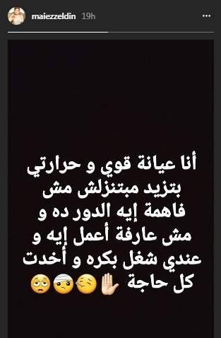 وجاء في المنشور ما يلي: "أنا عيانة قوي وحرارتي بتزيد مبتنزلش. مش فاهمة، إيه الدور ده، ومش عارفة أعمل إيه، وعندي شغل بكره وأخدت كل حاجة".