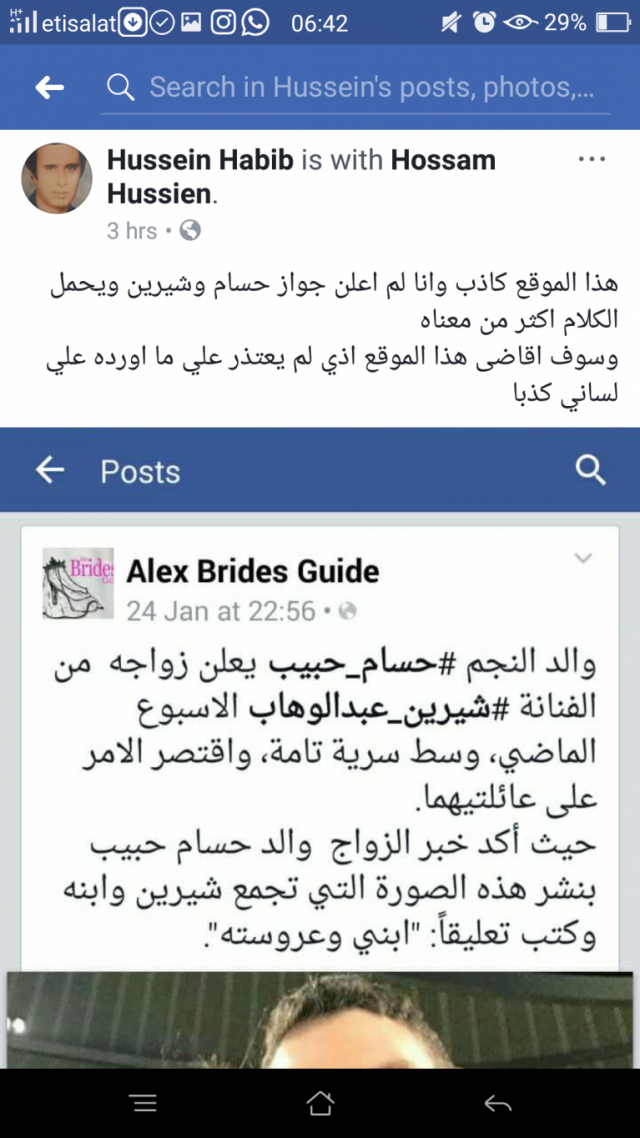 كما نفى والد حسام حبيب عبر حسابه على "فايسبوك"، أن يكون له أي علاقة بالأمر، وأعلن عن نيته مقاضاة الموقع الذي بث تلك الشائعة.