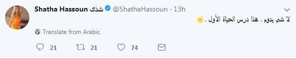 وفي التفاصيل، فقد كتبت شذى، عبر حسابها الرسمي على "تويتر": "لا شي يدوم، هذا درس الحياة الأول".