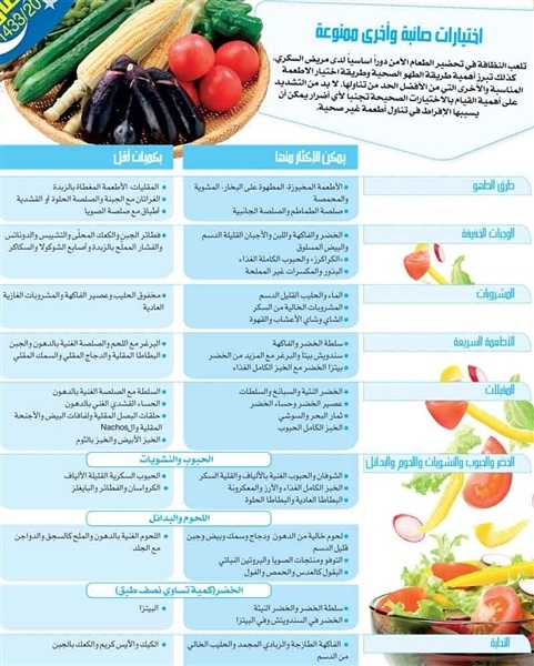 بشكل عام يحتاج مريض السكري إلى مراقبة دقيقة ليس فقط في نوعية الغذاء الذي يتناوله، بل أيضاً في طريقة تحضير الطعام ونظافته حفاظاً على سلامته وطريقة توزيع الوجبات. ثمة عوامل كثيرة تحتاج إلى قسط وافر من المعرفة والوعي.